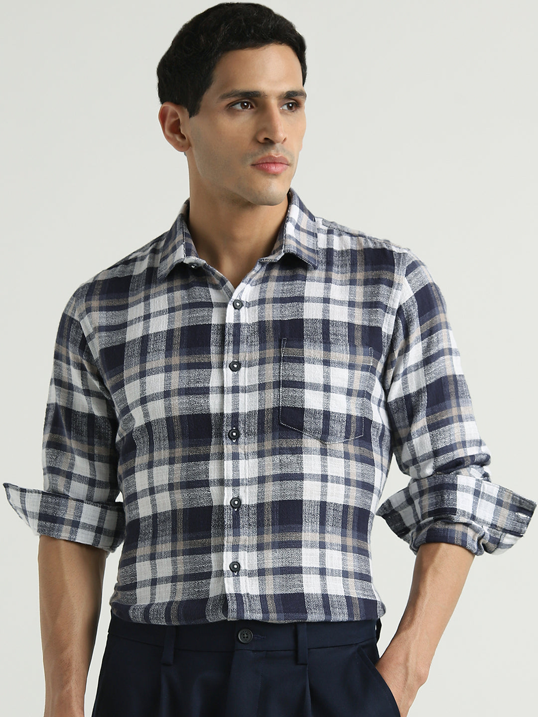 Add a modern touch to your casual collection with this grey and blue checked shirt. The balanced check pattern gives it a contemporary yet versatile look that works for a variety of occasions. Finished with classic button-front styling and a streamlined silhouette, it pairs perfectly with jeans or casual trousers.