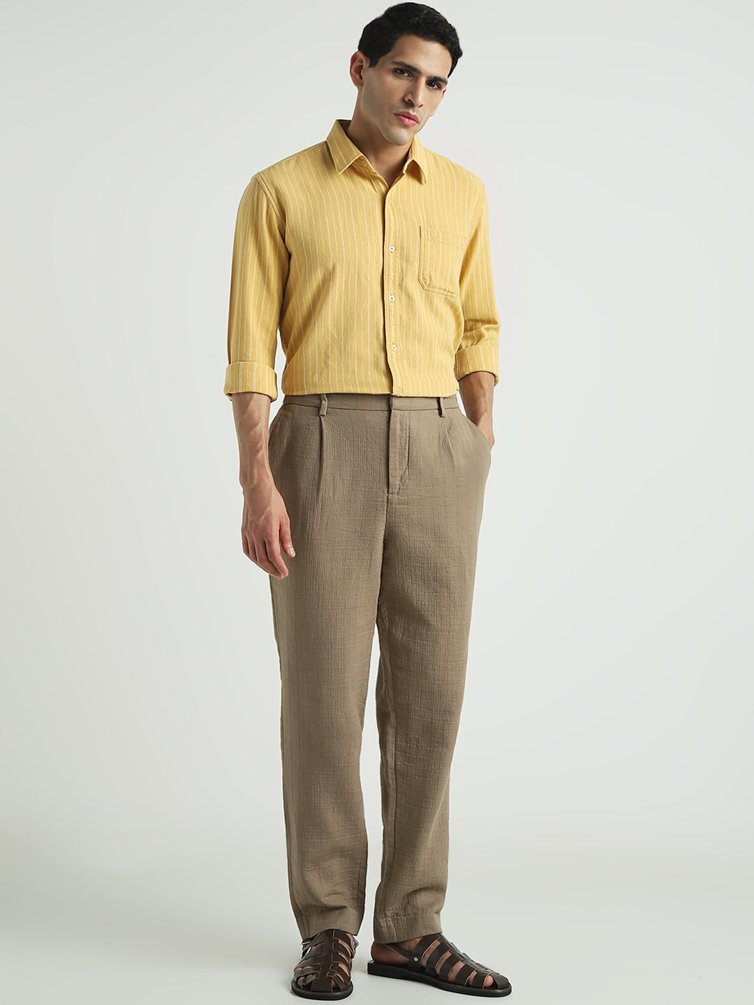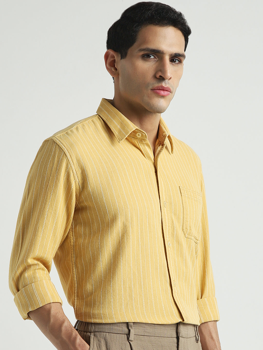 Add a vibrant touch to your casual collection with this mustard yellow striped shirt designed for effortless everyday styling. The fine stripe pattern enhances its modern appeal while maintaining a relaxed and versatile look. Finished with classic button detailing and a slim-fit profile, it pairs perfectly with denim or neutral trousers for casual outings.