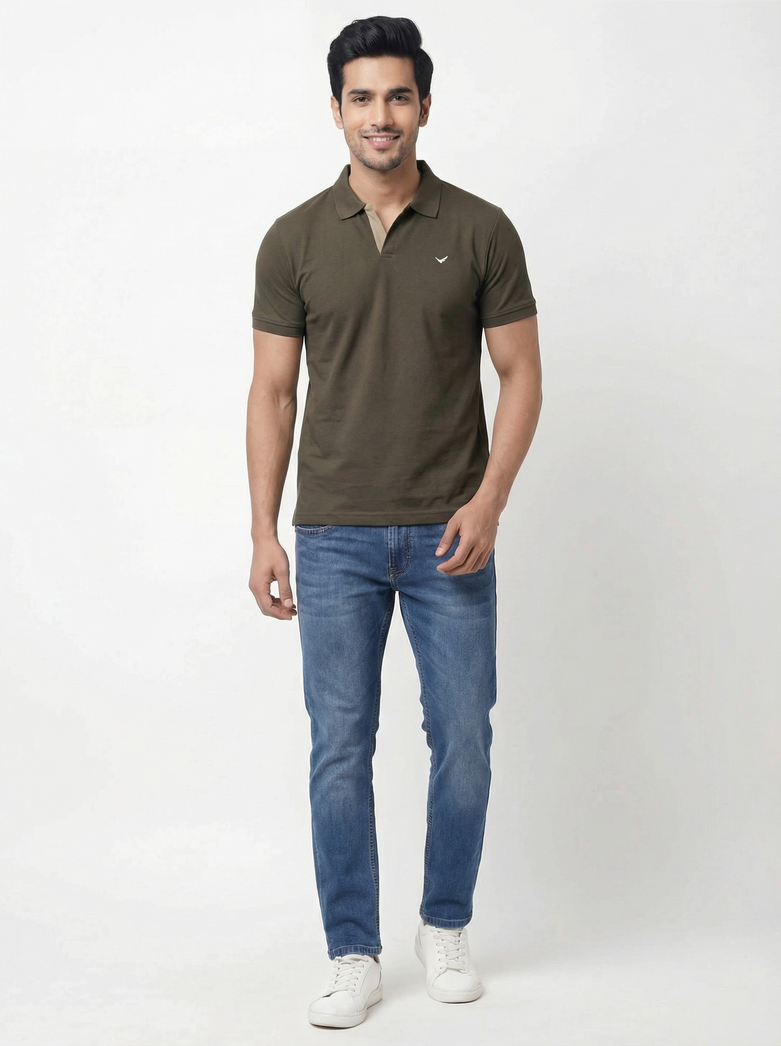 Olive Johnny collar T-shirt in a regular fit, crafted from soft cotton-blend fabric. Features short sleeves, subtle collar detailing, and a clean solid design for everyday casual style.